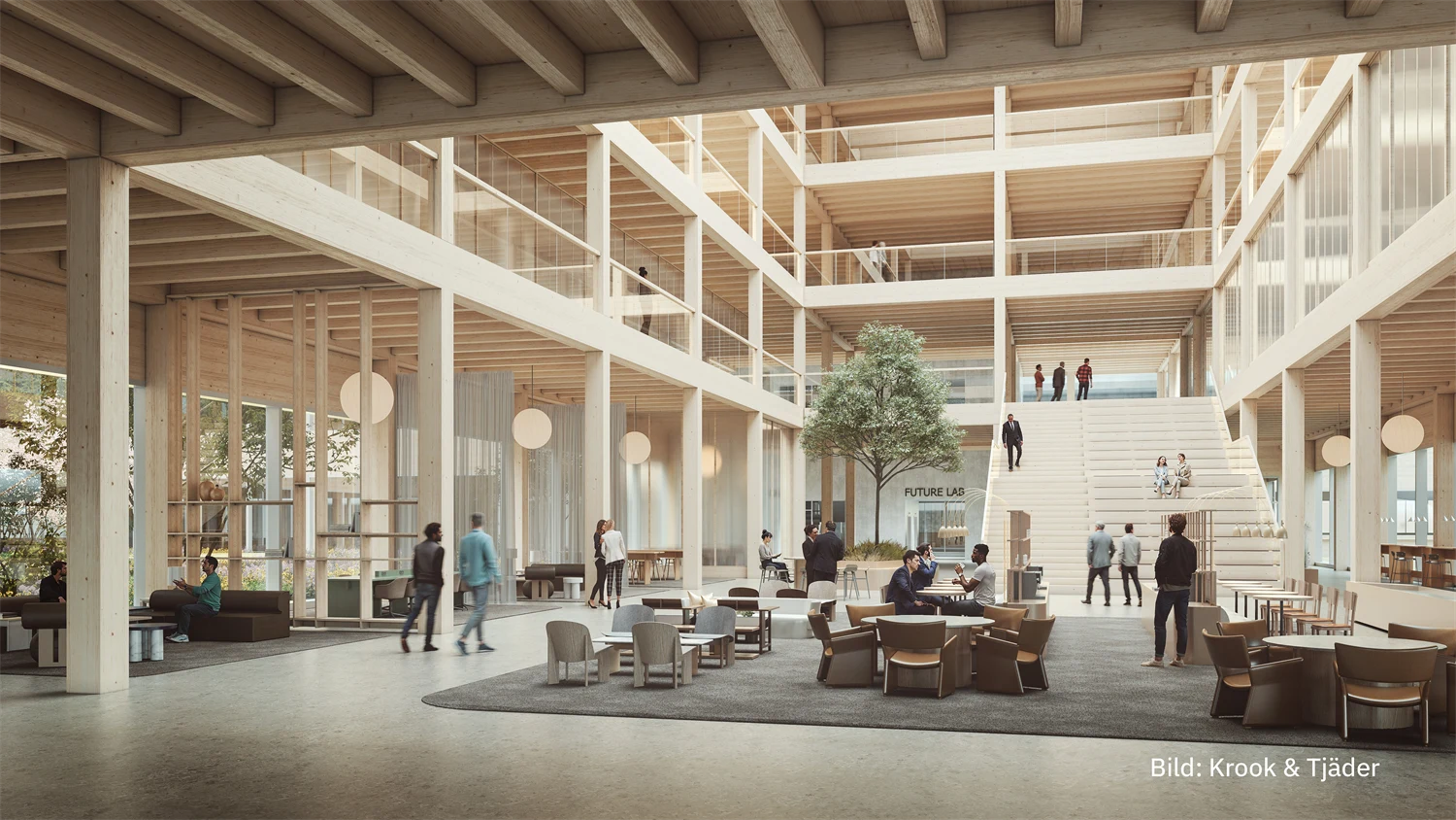 Named Atsumaru, a Japanese word meaning 'to gather', the building will be a place for meetings, collaboration and well-being. Constructed from CLT and glulam, the office building will contribute to reduced climate impact and a pleasant, natural indoor environment.