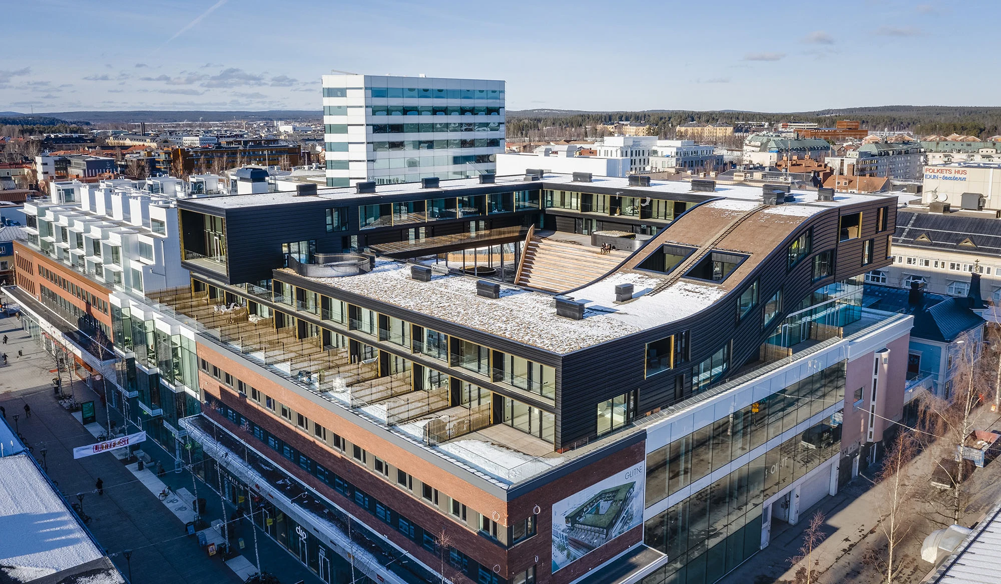 Mitt i centrala Umeå, ovanpå taket till gallerian Utopia, har en påbyggnad i limträ och KL-trä markant förändrat stadens siluett. De 49 exklusiva lägenheterna bildar tillsammans ett nytt kvarter som lever sitt eget liv, lite grann som en stad ovanför staden faktiskt. Med nytänkande planlösningar och spännande utformning av både uteplatser och gemensamma umgängesytor, tas de lätta träkomponenterna tillvara maximalt. Genom ett smart sätt att använda element som luft, öppenhet och synligt tre, skapas en känsla av landsbygd och lugn mitt i stadens myller.