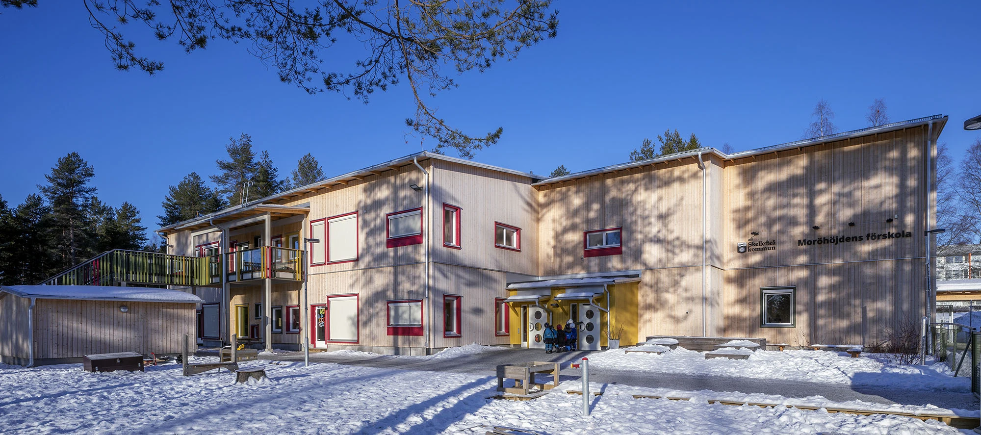 Moröhöjdens förskola är en 6-avdelningsförskola med tillagningskök. Fasaden är av träpanel och har behandlats med Sioo, ett miljöanpassat träskydd som gör att träet får silvergrå ton med tiden. Bjälklag och bärande innerväggar i KL-trä. Resultatet är en inspirerande förskola med naturligt trä och färgglada detaljer.