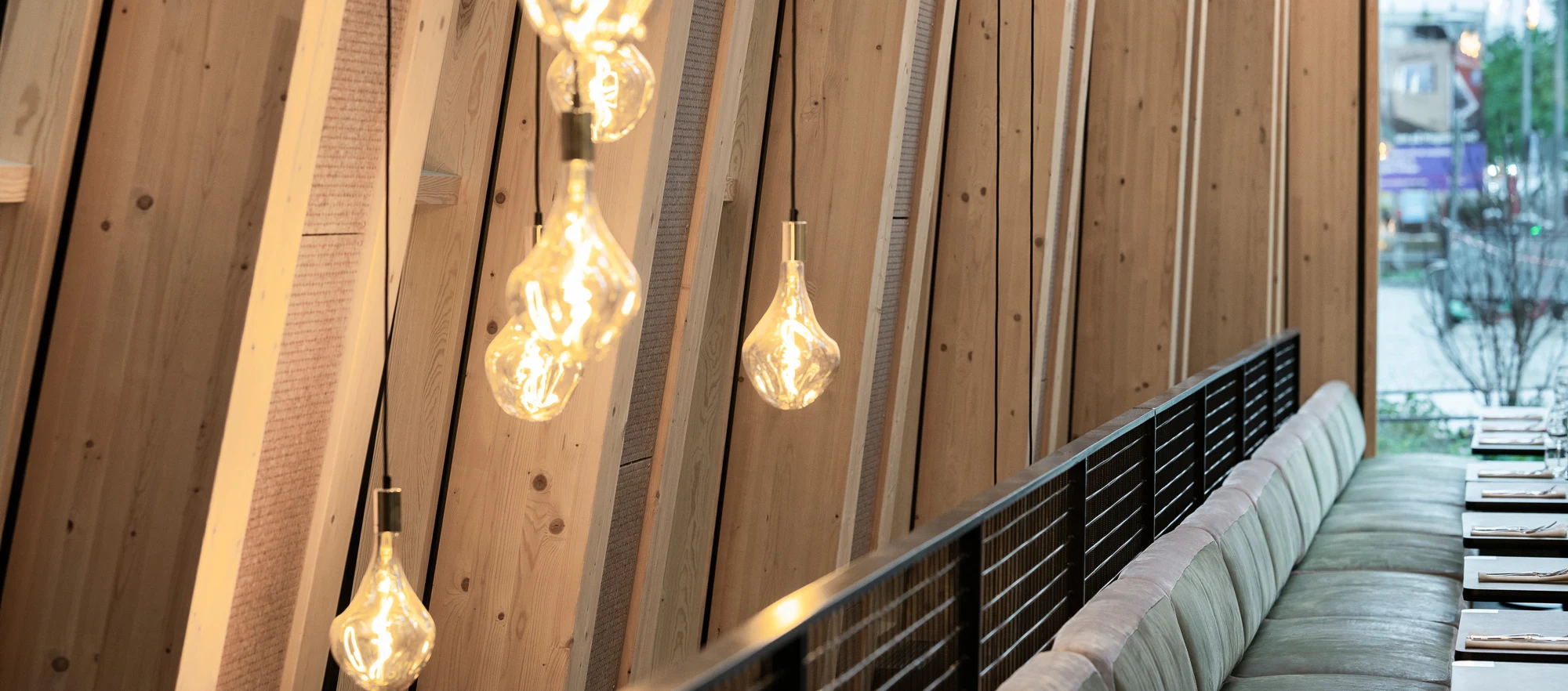 Restaurang Rummel öppnade i mars i en spektakulär paviljong på Norra Stationsgatan i Stockholm som är skapad av danska arkitektbyrån Henning Larsen. Byggnaden är en del av Humlegården Fastigheters satsning på att göra Norra Station till ett levande kvarter med kontor, restauranger, service och konst. Det sluttande taket som är tio meter högt i ena änden och fyra meter i den andra sticker onekligen ut med sin design. Martinsons Byggsystem har ansvarat för projekteringen, materielleverans och monteringen av stommen i limträ och KL-trä.