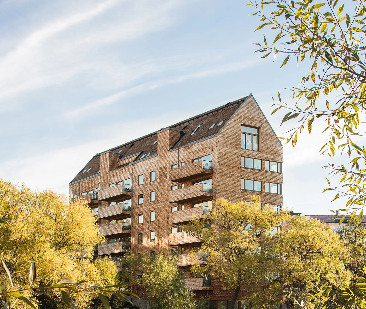 Ett åttavåningshus med 31 lägenheter byggt i en kombination av limträ och KL-trä. Fasaden är beklädd med cederspån.